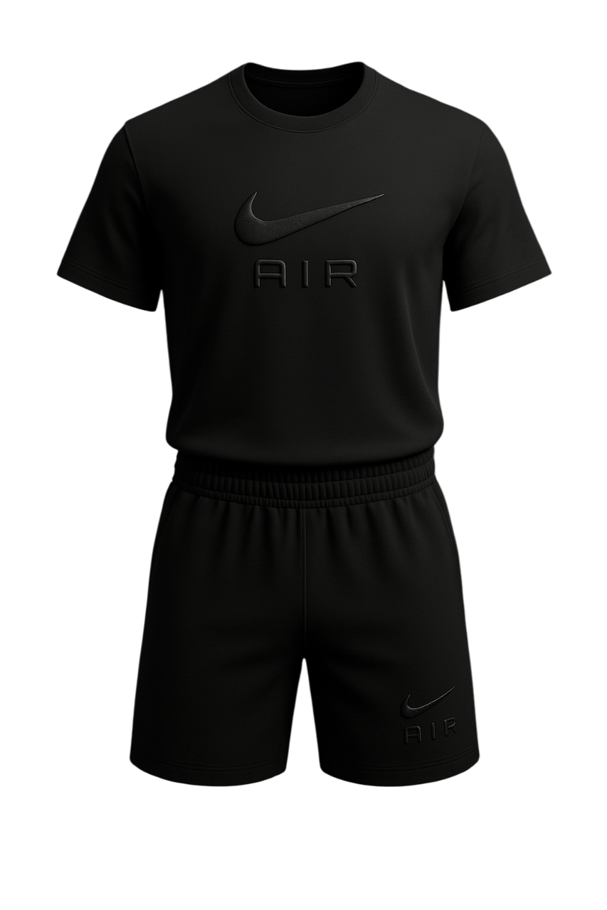Мъжки спортен сет Nike с къс ръкав и шорти в черен цвят. Изработен от лека и дишаща материя, която осигурява комфорт при тренировки и в ежедневието. Практичен и модерен избор за спорт, разходки или свободното време.
